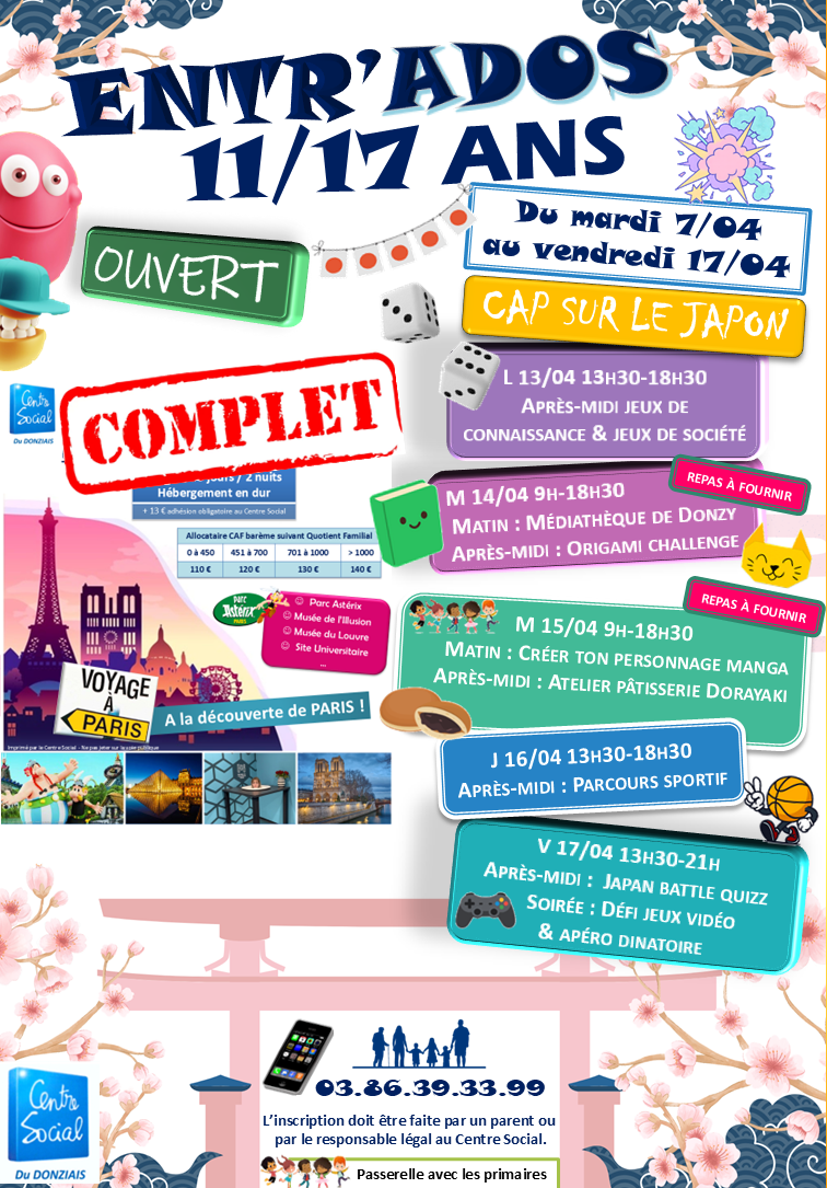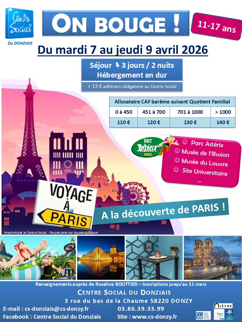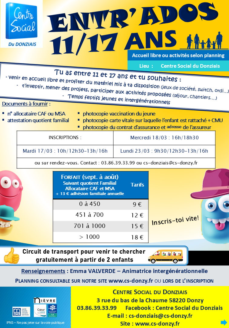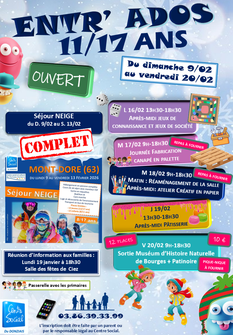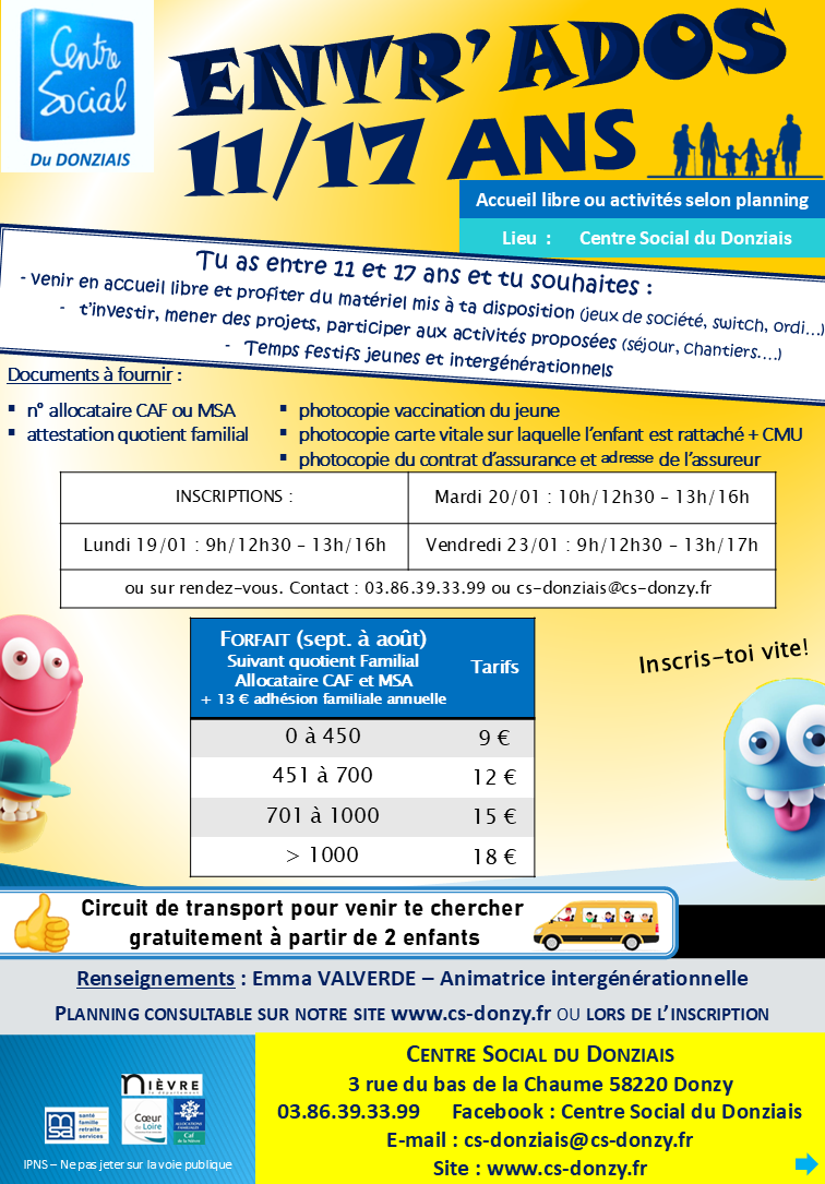Une salle spécifique « Ados » au 2ème étage du Centre Social avec en accès libre encadré : ping-pong, informatique, WII & PS4, jeux de sociétés,... et de nombreux projets à réaliser ! L’animateur jeunesse va chercher les jeunes au Collège de Donzy (sur inscription).