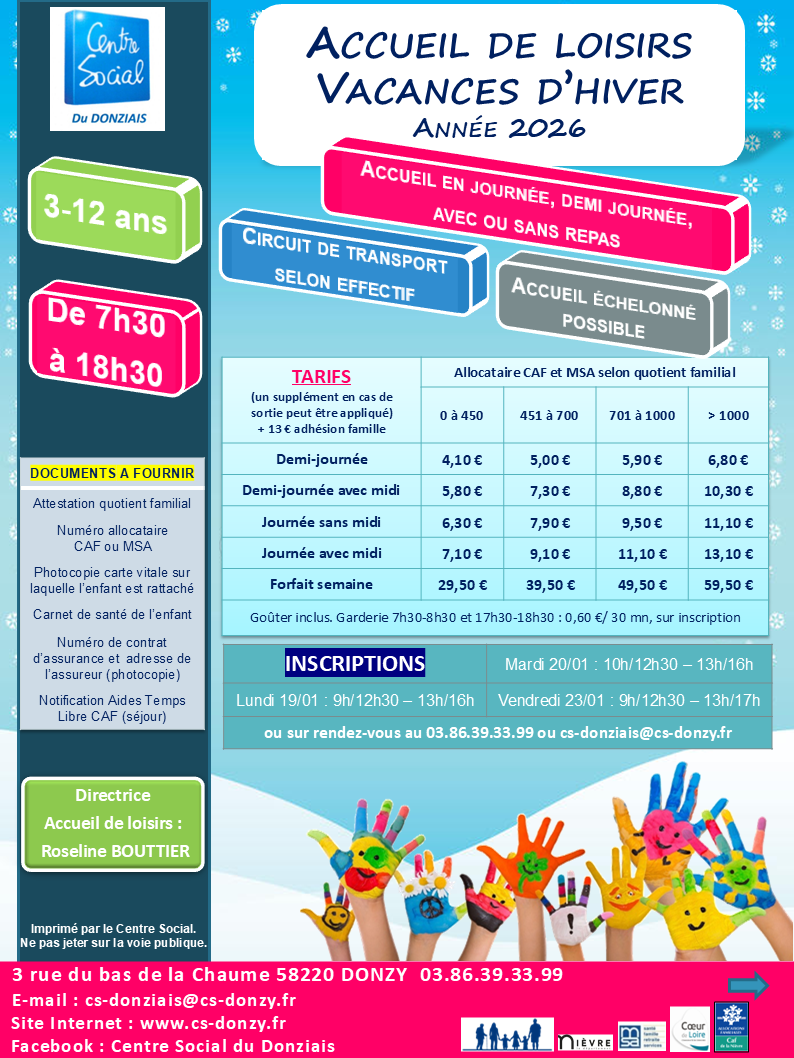 Nous accueillons les enfants de 3 à 6 ans domiciliés sur le territoire Donziais et également les enfants hors canton dont les parents travaillent sur le territoire du Donziais (en fonction des places disponibles).