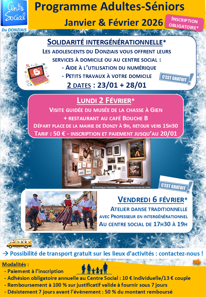 Adultes -Séniors Pour plus d'informations, contactez Emma VALVERDE au 03.86.39.33.99 Email : cs-donziais@cs-donzy.fr