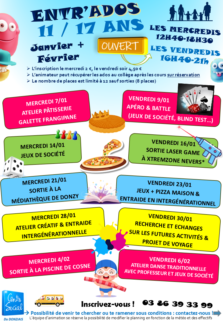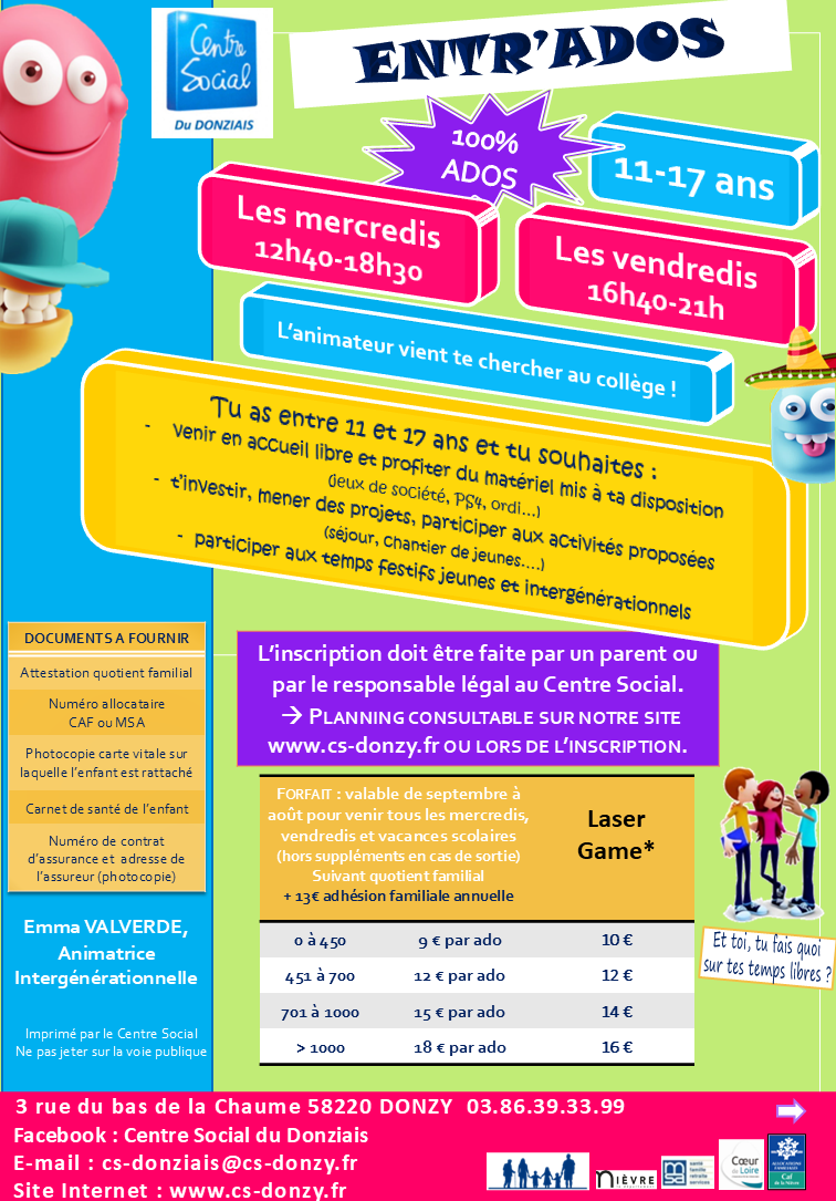 Une salle spécifique « Ados » au 2ème étage du Centre Social avec en accès libre encadré : ping-pong, informatique, WII & PS4, jeux de sociétés,... et de nombreux projets à réaliser ! L’animateur jeunesse va chercher les jeunes au Collège de Donzy (sur inscription).