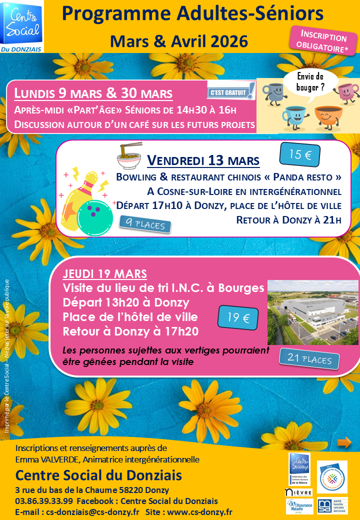 Adultes -Séniors Pour plus d'informations, contactez Emma VALVERDE au 03.86.39.33.99 Email : cs-donziais@cs-donzy.fr