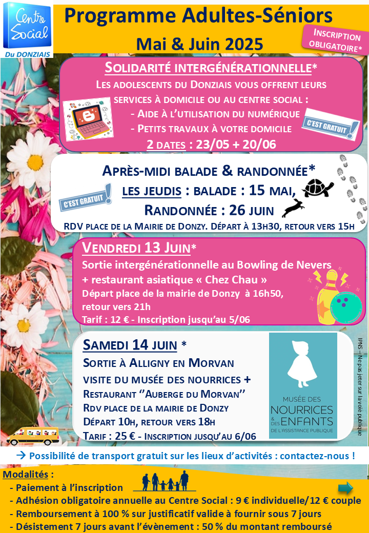 obligatoire. Adhésion annuelle au Centre Social : 13 €.