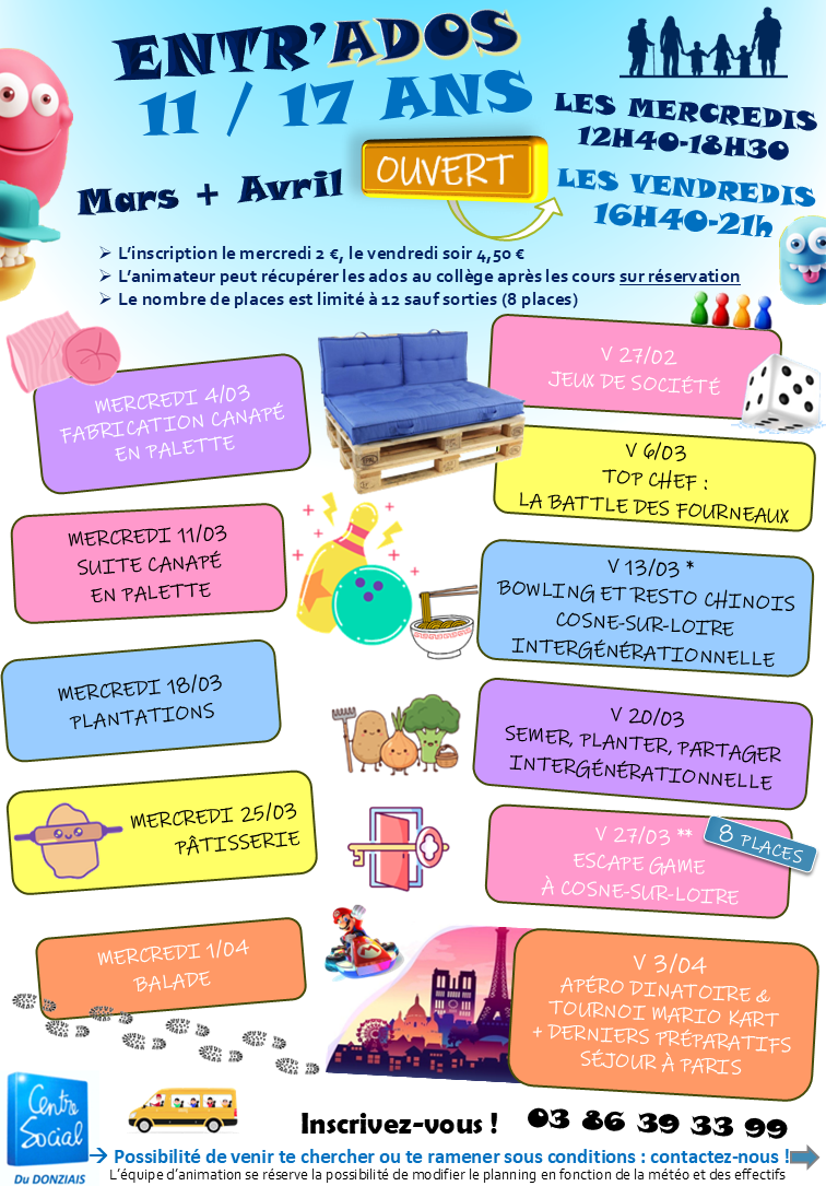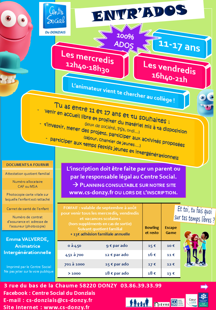 Une salle spécifique « Ados » au 2ème étage du Centre Social avec en accès libre encadré : ping-pong, informatique, WII & PS4, jeux de sociétés,... et de nombreux projets à réaliser ! L’animateur jeunesse va chercher les jeunes au Collège de Donzy (sur inscription).